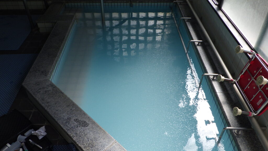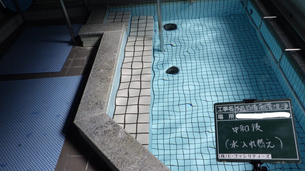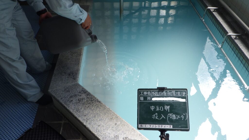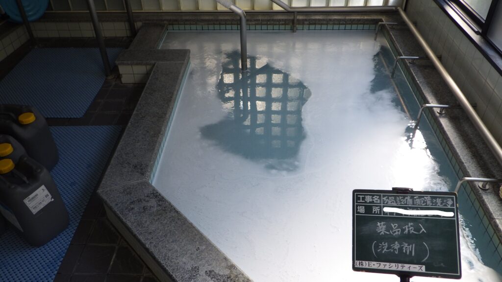 入浴施設のろ過器の点検・管洗浄・水質検査等を行っております。水を張った浴槽に薬剤を投入し、ろ過装置を循環させ管内の洗浄を行います。安心安全な入浴施設の提供、管理を心掛けております。