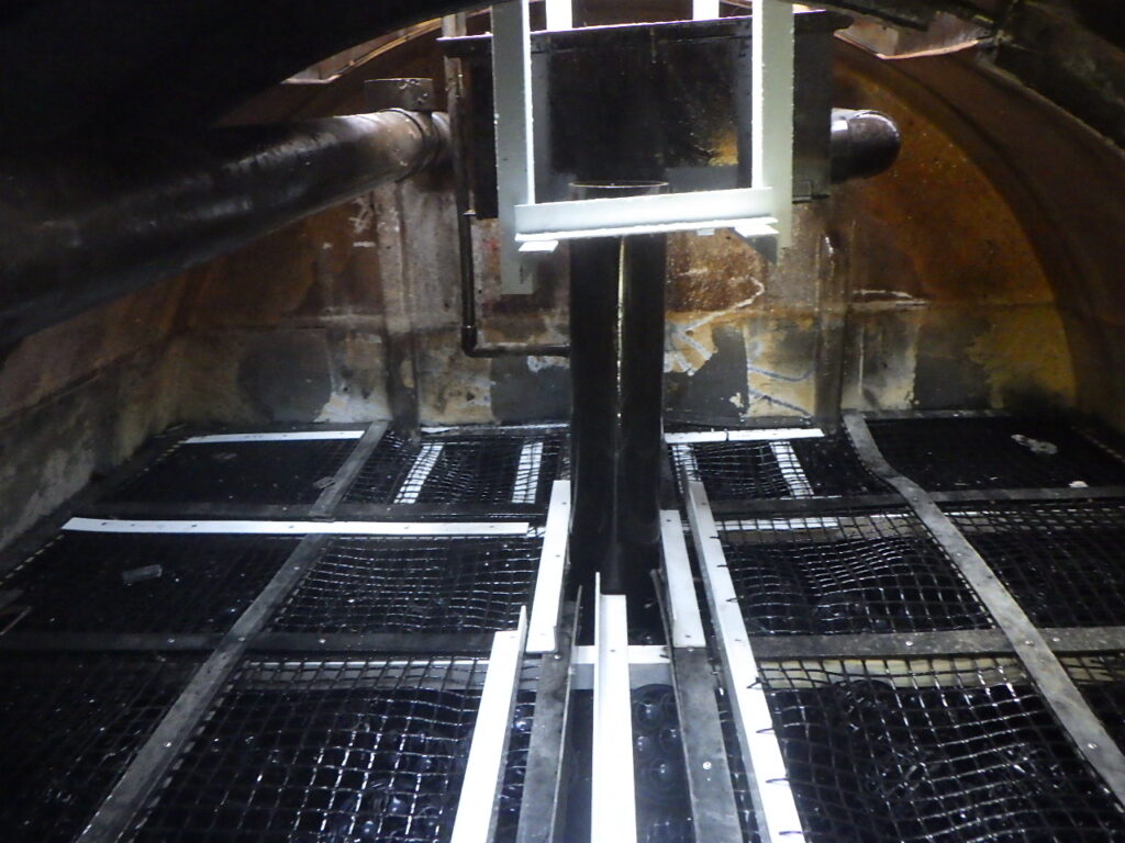 受け架台を作成後、格子ろ材受けを設置し、槽内にろ材を戻し入れ作業が完了しました。
